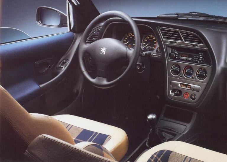 A l’intérieur, les sièges sport proviennent de la S16 (lire aussi : Peugeot 306 S16) mais récupèrent d’amusants appuis-tête en forme de ballon de rugby. La sellerie est un mix entre le cuir crème et un tissu vert et bleu marine, très « casual chic » justement. Les sur-tapis sont eux aussi siglés Eden Park, et le volant gainé de cuir. Enfin, on peut opter soit pour la climatisation, soit pour le toit ouvrant, mais pas les deux en même temps, le tout pour 10 000 francs (toit ouvrant) ou 15 000 frans (climatisation) de plus qu’une Turbo Diesel « classique ». Le semi-luxe se paie !