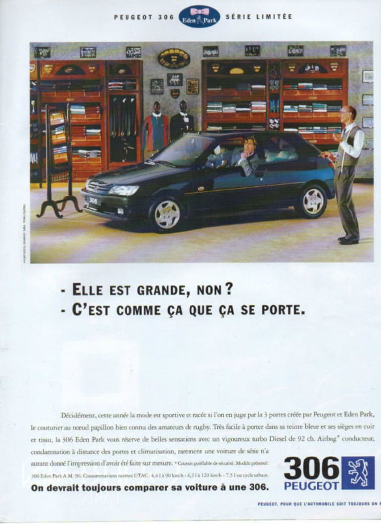 Souvent, les séries spéciales trahissent un besoin de déstockage, et le choix du co-branding peut parfois paraître un peu « cheap ». Pourtant, chez Peugeot, l’alliance avec une marque pour une série limitée dans les années 80 ou 90 a souvent été brillante, donnant naissance à des véhicules plutôt recherchés aujourd’hui. Normal, la marque au Lion s’appuyait alors sur des marques dans l’air du temps, et plutôt haut de gamme sans aller jusqu’au luxe: parfait pour rehausser l’image de véhicules de petite ou moyenne gamme. Après Lacoste, puis Roland Garros (toujours d’actualité), Peugeot s’appuyait sur la jeune marque (à l’époque) Eden Park pour rendre encore plus sexy sa 306 !