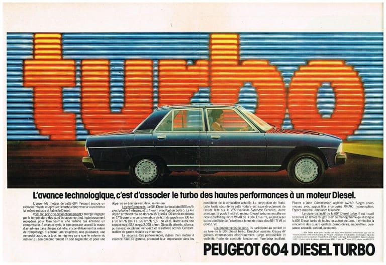La 604, il est vrai, ne joue pas exactement la même partition. Chez Peugeot, on laisse aux berlines et breaks 504 le soin de véhiculer les familles. Le V6, aussi perfectible soit-il, demeure synonyme d’une certaine exclusivité au sein de la production française qui, en raison notamment d’une fiscalité délirante, ne compte plus aucune marque ni modèle de prestige depuis une bonne quinzaine d’années. Jusqu’à son patronyme, la 604 revendique cette spécificité hexagonale, qu’elle ne partage qu’avec les coupés et cabriolets 504, la Renault 30 et l’Alpine A310, nanties du même moteur. Tout entière pensée autour de son six-cylindres, la berline sochalienne lui doit à la fois sa majesté et son dépérissement, dans un pays durement frappé par le premier choc pétrolier — et qui s’apprête à en encaisser un autre. Pour autant, l’exemple de Mercedes-Benz, qui écoule sans peine sa série 123 dans ses variantes Diesel sans détériorer son image, n’a pas échappé aux dirigeants de Peugeot, qui savent aussi qu’en Amérique du Nord, le même constructeur n’a pas hésité à implanter son cinq-cylindres suralimenté sous le capot de sa Classe S. Dès ce moment, le turbocompresseur apparaît comme un accessoire providentiel, qui va débarrasser le Diesel de l’une de ses principales tares : une puissance trop limitée, réduisant l’agrément de conduite au néant. Dès lors, la greffe d’un tel moteur sous le capot de la 604 devient envisageable, d’autant que le Lion est très actif aux États-Unis, où le Diesel connaît un essor inattendu.