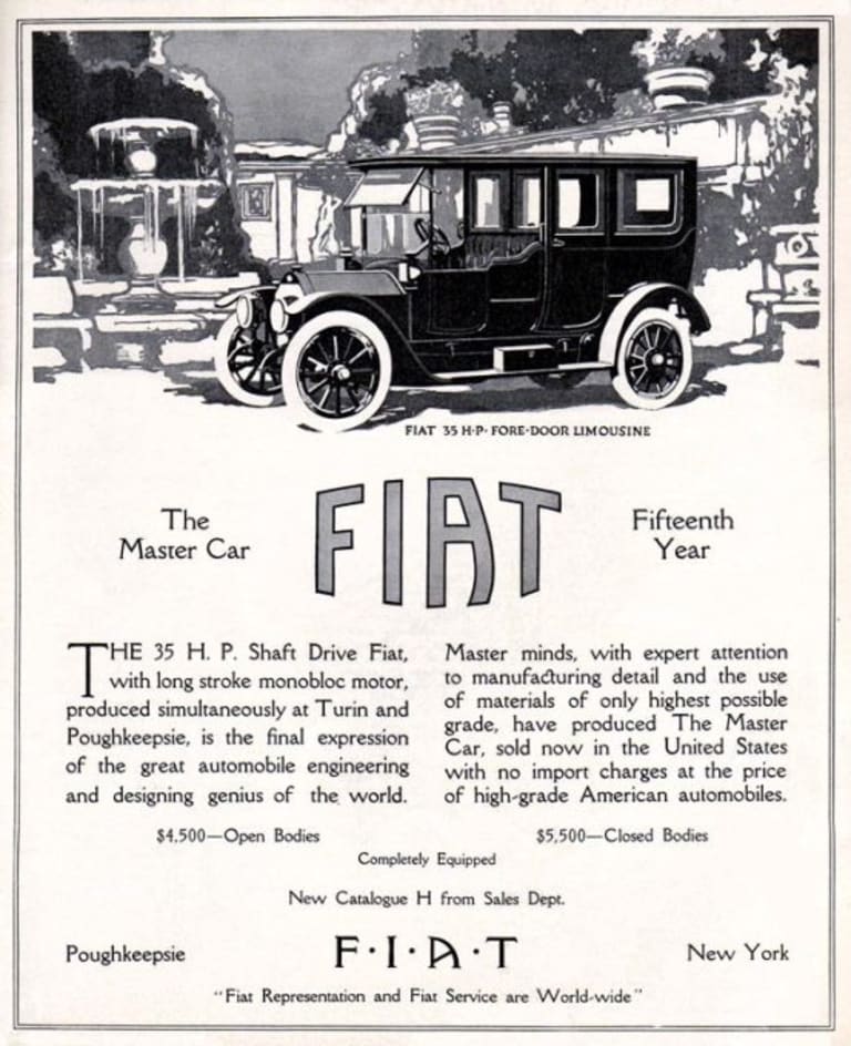 En 1910, Agnelli inaugurait l’usine de Poughkeepsie, et la production des luxueuses Fiat 54 puis 55 commença sur le sol américain. Pourquoi Poughkeepsie fut-elle choisie ? Nul ne le sait : le bas prix des terrains sans doute, allié à la proximité de l’Hudson (pour acheminer les pièces détachées venues d’Europe et débarquée à New York). En 1912, Fiat lançait un modèle dédié au marché US, la Tipo 56, dotée d’un 6 cylindres en ligne de 8.6 litres et 45 chevaux (les précédentes Fiat 54 et 55 étaient des 4 cylindres). Les grosses automobiles de Fiat se vendaient entre 4000 et 9000 $ suivant les modèles, à comparer aux 1000 $ d’une Ford T.