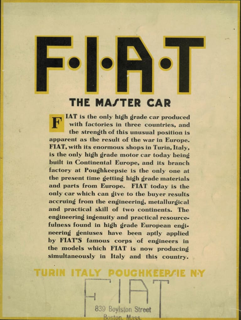 Poughkeepsie n’est pas une ville très connue des Etats-Unis, il faut l’admettre. Outre les gens du coins, ceux qui connaissent cette ville sont sûrement des lecteurs assidus de SAS, car avant de s’installer définitivement au château de Liezen, son Altesse sérénissime le Prince Malko Linge y habitait « un petit cottage de Robin Hill Drive ». D’autres plus érudits signaleront qu’y repose le Pierre Teilhard de Chardin, chercheur, théologien et philosophe. Mais combien savait qu’entre 1909 et 1918 Fiat s’y installa pour y produire ses berlines de luxe destinées aux Etats-Unis ?