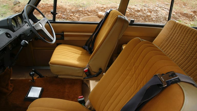 Ainsi est-il instructif d’inventorier les dimensions de la toute première Range : 4,47 mètres de long pour 1,78 mètre de large (et pareil en hauteur) ; des valeurs dictant des proportions insolites pour l’époque. À un centimètre près, l’auto équivaut à une berline Peugeot 504 en longueur, mais la dépasse de près de dix centimètres en largeur, ce qui contribue à déterminer un habitacle aux volumes inusités, dont le conducteur et le passager avant ne profitent guère, rejetés qu’ils sont contre les portières par un tunnel de transmission particulièrement imposant. S’il est vendu au même prix qu’une Porsche 911, le modèle n’égale pas, à beaucoup près, l’encombrement d’une Mercedes-Benz Classe S contemporaine, contrairement au type L460 dévoilé l’année dernière et, en ville, la Range Rover des origines se déplace sans ostentation au milieu des seventies, seule sa hauteur lui permettant de s’extirper de la masse laborieuse des Ford Escort ou des Renault 5. Longtemps, la Range ne sera pas un marqueur social et cette frugalité se confirme lorsque l’on ouvre l’une des très larges portes, à l’aide d’une palette verticale dont la typicité a fait l’objet de sympathiques clins d’œil par la suite. On traquerait en vain le moindre indice de luxe dans cet habitacle dont la luminosité laisserait songeur plus d’un conducteur d’Evoque : les plastiques du mobilier de bord sont misérables, la pauvreté du combiné instrumental ne déparerait pas à bord d’un Saviem SG2, les sièges sont revêtus d’un skaï austère et la moquette est aux abonnés absents. Pour autant, on s’installe avec plaisir dans des sièges accueillants, combinés à une suspension compréhensive dont les débattements garantissent aussi bien le confort postural des occupants que les capacités hors-piste de la voiture.