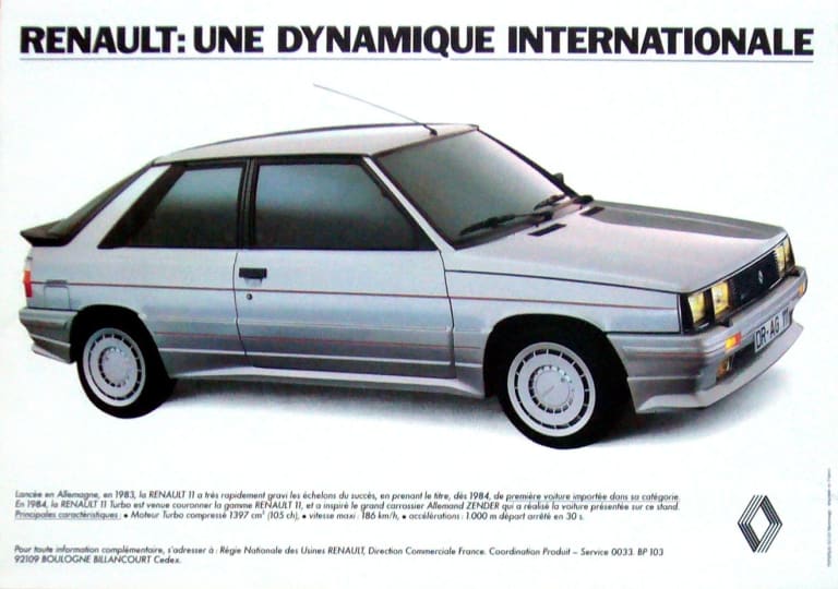 La Renault 11 Turbo en survêtement, après avoir enfilé son kit Zender La longévité des composants techniques entre en contradiction avec la généalogie des modèles commercialisés. Dans sa version première, le « Cléon-fonte » de l’ingénieur René Vuaillat, L4 à arbre à cames latéral, équipait la Floride S de 1962-1963 et la R8. Cette même base, rééquipée, atteignit les Super 5, Express, R19, Clio I, puis II, Mégane et Scenic, Kangoo I et Twingo. Voilà un moteur durable pour des modèles voulus changeables par nécessité commerciale dont le marché façonne les rythmes. Les commerciaux avaient de l’ouvrage pour vendre les variantes de Renault 11, y compris dans leurs versions d’appel rehaussées d’autocollants à peu de frais et d’anglicismes faciles, Spring et Broadway.