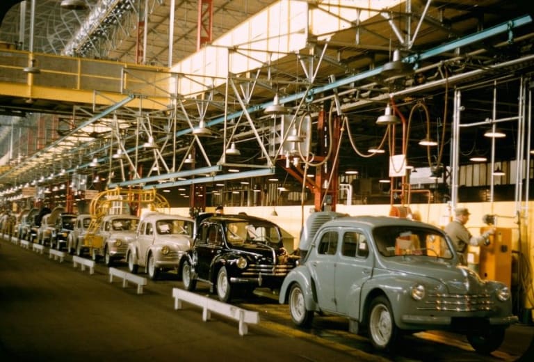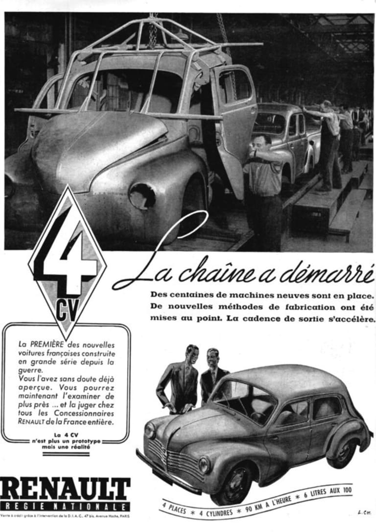 La petite 4CV est une révolution pour Renault. Jamais la marque n’avait produit une aussi petite voiture, aussi populaire. C’est aussi une révolution industrielle, avec la production à la chaîne sur un modèle fordiste, autorisant de forts volumes. La production débute en mai 1947 et, rapidement, la 4CV trouve son public à tel point que des délais d’attente de plus d’un an se créent dès 1948. Le pari de Lefaucheux est rempli. Dès 1949, la petite Renault monte un peu en gamme (en même temps que le niveau de vie des Français commence à s’élever) avec une finition Grand Luxe passant à 21 chevaux : à cette époque, Citroën lance à peine sa toute nouvelle 2CV. En 1950, une version sportive dénommée 1063 est produite à 80 exemplaires (et disposant cette fois de 32 chevaux). La 4CV connaîtra une carrière sportive non négligeable (avec notamment Jean Rédélé à son volant) et des dérivés intéressants, comme l’Alpine A106 du même Rédélé.