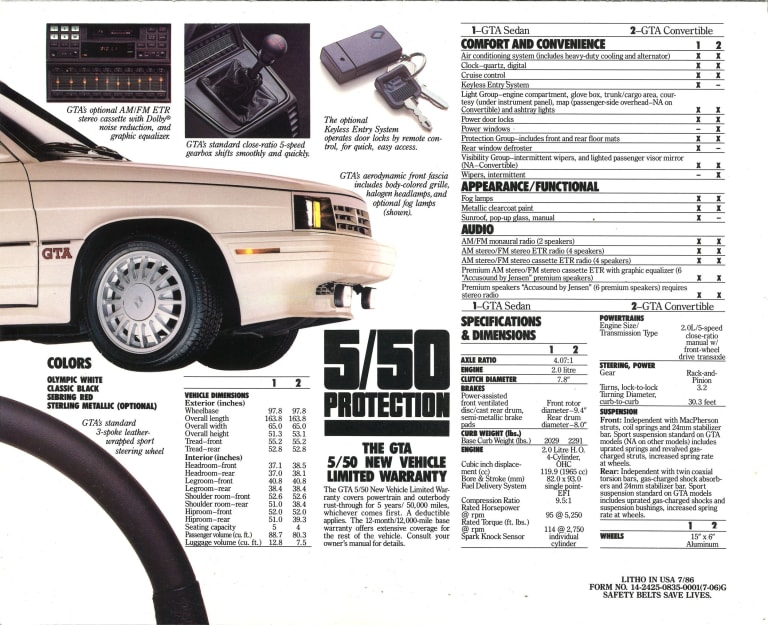 Pourtant, les ingénieurs français n’allèrent pas jusqu’au bout : malgré la bonne base des R9 et R11 Turbo, développant 105 puis 115 chevaux, la GTA n’eut droit qu’à un moteur atmosphérique, un 2 litres de 95 chevaux couplé à une boîte manuelle 5 vitesses. Pourquoi ce choix ? Sans doute pensèrent-ils que la clientèle américaine, bien que désireuse d’une allure sportive, n’était pas prête à la brutalité du turbo ? Nul ne le sait, mais la presse américaine fut assez convaincue du résultat, louant la tenue de route de la nouvelle GTA, parue en toute fin d’année 1986. La GTA paraissait transfigurée par rapport à l’Alliance et son 1.7 litres de 77 chevaux.