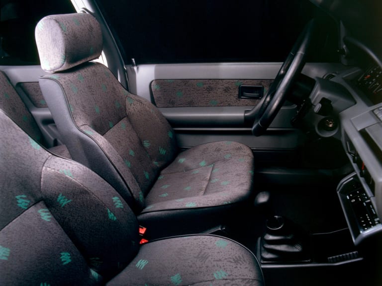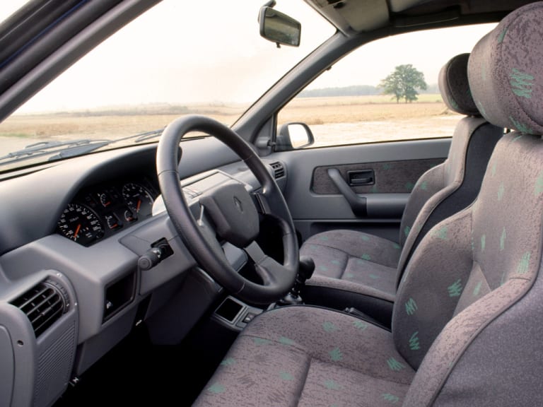 A l’économie, Renault avait d’ailleurs su donner un look sportif à cette petite Clio S avec pas grand chose : un liseré vert sur les pare-chocs et les baguettes latérales, des jantes en tôle peintes en blanc au design assez sympa, et hop, c’est terminé (en 1994, les pare-chocs seront peints couleur carrosserie). A l’intérieur, volant de 16S, tout comme les sièges « baquet », et une sellerie comme seules les années 90 pouvaient en produire. Pour le reste, pas grand chose, pas même un compteur spécifique. Sportif on vous dit, au point de vous permettre de vous muscler le bras avec une petite manivelle située sur la contre-porte : magie de la technique !