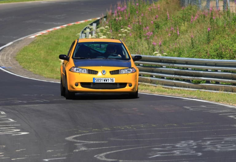 La première Mégane R.S. apparaît donc au Salon de Francfort 2003. Son capot abrite le célèbre F4RT qui, reprenant la cylindrée de 1998 cm3 connue et très répandue chez Renault depuis la Clio Williams, a subi un véritable traitement de choc. Au vrai, le groupe « F » existe déjà, au préalable, en version « turbo light » de 165 ch – on peut notamment la trouver dans la Laguna II ou la malheureuse Avantime – mais les motoristes de Renault Sport Technologies, installés dans l’ex-usine Alpine de Dieppe, se sont évidemment orientés dans une tout autre direction. Dans la Mégane sommitale, la puissance fait un bond de 60 ch tandis que le couple passe de 271 à 300 Nm, disponibles dès 3000 tours/minute. Les chronos sont à l’avenant : Renault revendique une vitesse maximale de 236 km/h (sur circuit, bien entendu…), un 0 à 100 km/h abattu en 6,5 secondes et un kilomètre départ arrêté accompli en 26,7 secondes. De quoi tenir tête, pour ne prendre que cet exemple, à une Porsche Boxster 2.7 Typ 986, il est vrai alors à son couchant – et, surtout, de remettre les pendules à l’heure vis-à-vis des Honda Civic Type R, Ford Focus RS, Seat Leon Cupra ou Opel Astra OPC, rivales désignées de la Dieppoise, en cette époque où il est de bon ton de revendiquer le meilleur tour (pour une traction, s’entend) sur la Nordschleife !
