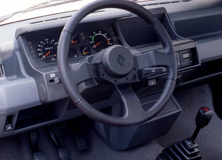 Toutefois, comme dans les années 70, il existe toujours une clientèle qui, sans afficher de velléités pour la conduite sportive et la chasse aux chronos, aspire néanmoins à un comportement moins dormitif que celle des citadines les plus répandues qui, à l’époque, se contentent de puissances comprises entre 45 et 60 chevaux. D’emblée, les Supercinq GTS et TSE s’efforcent de répondre à ces attentes certes marginales, mais qui représentent tout de même, compte tenu des volumes de production, un sous-segment qu’il ne faut pas négliger ; nanties d’un 1,4 litre de 72 chevaux, ces variantes ne craignent pas d’emprunter les grands axes et revendiquent des performances chiffrées déjà honorables pour l’époque (167 km/h en pointe et le kilomètre départ arrêté en 33,3 secondes selon les données officielles de Renault). Et sur cette même base que la TS fait son apparition à l’été 1985, faisant honneur aux aptitudes bien connues de son constructeur en matière de patchworks techniques et esthétiques. Qu’on en juge : conçue pour séduire une clientèle plus « jeune » que celle de sa matrice, la TS n’est en fait rien d’autre qu’une GTS dépouillée d’un certain nombre d’équipements, disponible uniquement en trois portes et dotée d’accessoires et d’une décoration censés suggérer une certaine sportivité. L’auto reprend ainsi les roues en tôle de la GT Turbo « Coupe » et arbore un bouclier avant dotée de projecteurs antibrouillard. À l’intérieur, l’on trouve le volant de la GT Turbo et un combiné équipé de l’indispensable compte-tours (mais moins complet que celui des GTS et TSE), alors que le reste de l’équipement se rapproche plutôt d’une TL, sièges y compris – la TS n’a pas droit aux confortables sièges « pétale » des Supercinq plus onéreuses…