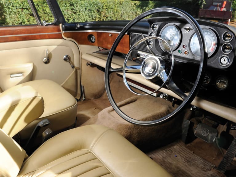 Rover lance sa grande berline en 1958. Son style, dû à David Bache, conserve un air de famille avec la P4 mais semble d’une autre génération, bien plus dans l’air du temps. Massive et plus statutaire, elle conserve malgré tout une certaine finesse et gagne en sex-appeal. “P5” n’est qu’un nom de code, car en réalité, elle porte le nom de Rover 3 litres. Sous son capot, on trouve le 6 cylindres en ligne déjà présent sous le capot de la P4, mais réalésé à 3 litres, comme son nom l’indique. Avec 115 chevaux, la nouvelle berline anglaise frôle alors les 160 km/h de vitesse de pointe. D’abord dotée de freins à tambours, elle récupère fort heureusement des freins à disques à l’avant dès 1959.