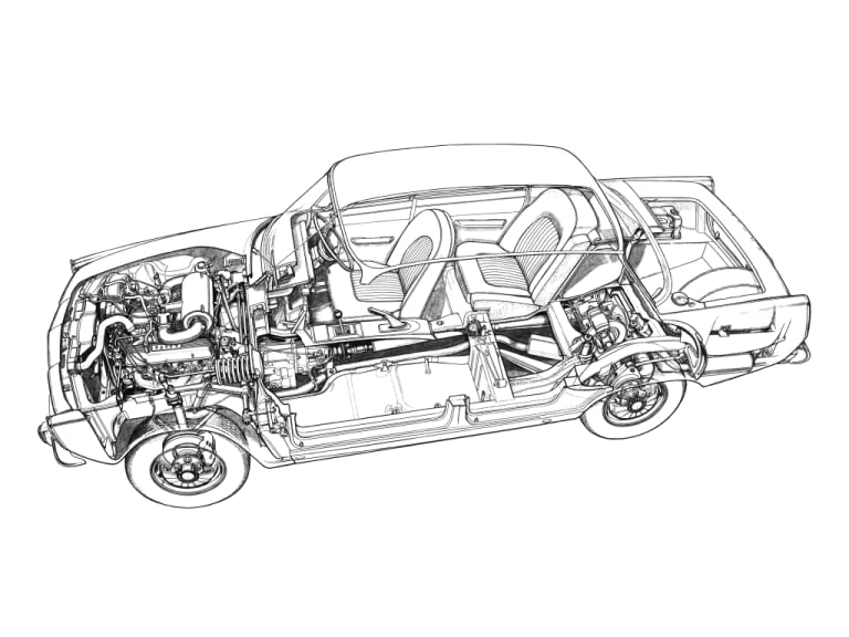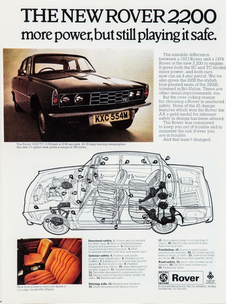 On va donc leur proposer une voiture de taille moyenne (entre la P4 et la P6 quoi) équipée d’un moderne 4 cylindres (en lieu et place des L6 des 50’s) développé pour l’occasion et développant 102 chevaux (il évoluera jusqu’à 124 chevaux sur la 2000 TC à double carburateurs). La coque est autoporteuse, les 4 freins sont à disques, la carrosserie comprend des panneaux d’aluminium tandis que la suspension est assez innovante, bref, on est loin de la Rover “à Papa” de la décennie précédente. A l’intérieur, ce n’est ni Rolls, ni Bentley, ni même Jaguar, mais on reste dans cette fameuse ambiance so british, avec un peu moins de bois et de cuir cependant.