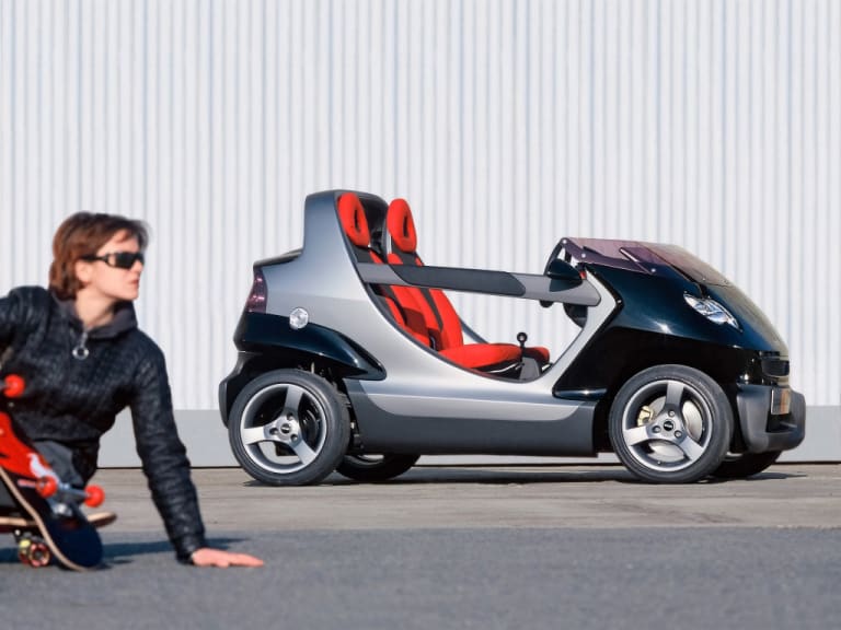 En 2001, la petite Smart Fortwo fêtait déjà ses 3 ans d’existence, et n’avait pas particulièrement évolué depuis son lancement en 1998. Les roadsters et coupés se faisaient attendre, tout comme la future ForFour (lire aussi : Smart Forfour). Il était temps de proposer un peu d’animation sur les salons, histoire de faire patienter les fans, les futurs clients ou la presse, et de faire parler un petit peu de la marque. S’agissant d’un concept-car, les designers et ingénieurs se laissèrent aller en proposant un Crossblade Concept étonnant et détonnant : il s’agissait ni plus ni moins que d’une Smart minimaliste, sans toit, sans pare-brise, sans portière (si ce n’est des barres latérales faisant office de « barrières »), bref, sans rien quoi !