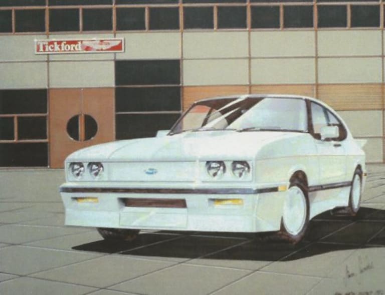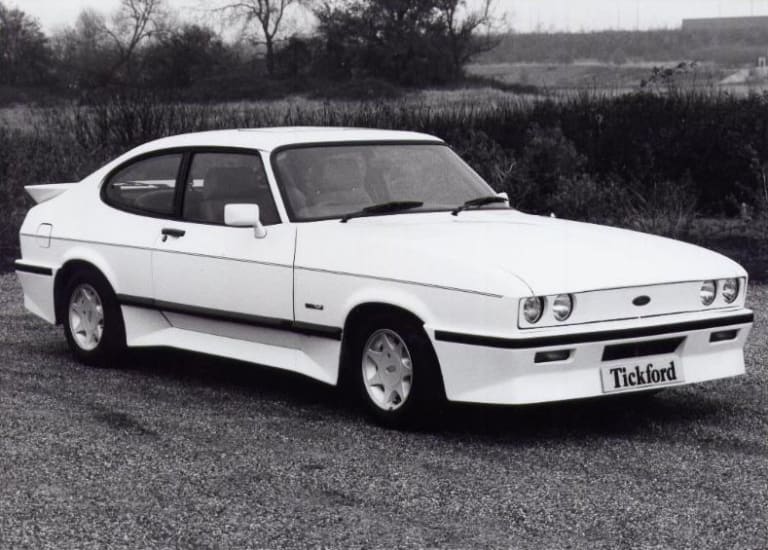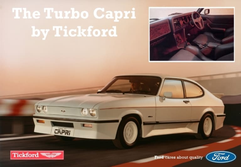 En 1981, l’idée fait son chemin chez les deux partenaires : celle d’une voiture ayant le look et les performances d’une Aston Martin Vantage, tout en gardant les avantages d’une Capri. La Tickford Capri Turbo ne sortira qu’en 1983, et sera dotée du V6 2,8 litres turbocompressé, disposant d’une puissance de 205 chevaux (pour une vitesse maxi de 220 km/h. A l’intérieur, la Tickford se pare d’une sellerie mi cuir-mi tissu, et de boiseries au tableau de bord. Elle nécessite 200 heures de travail, car elle est quasiment réalisée à la main.