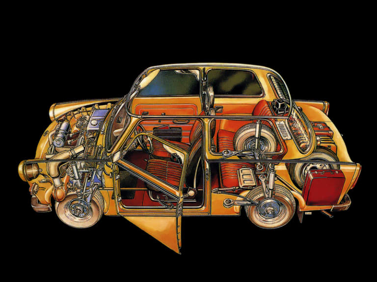 Bref, la P50, dotée d’un bicylindre 2 temps de 499 cm3 d’une puissance de 18 ch (131 435 exemplaires), évoluera en 1962 en une version P60 plus puissante (594 cm3 et 23 ch, et 107 007 exemplaires jusqu’en 1965). Et notre 601 alors ? Dès le début des années 60, l’idée de moderniser cette « voiture du peuple est-allemand » travaille les ingénieurs. La 601 sera donc essentiellement une évolution esthétique, avec une carrosserie lui donnant un air de 404 en réduction qui fait encore son charme aujourd’hui. Elle sortira en 1963, récupérant le moteur de 594 cm3 de la P60 avec laquelle elle cohabitera 2 ans.