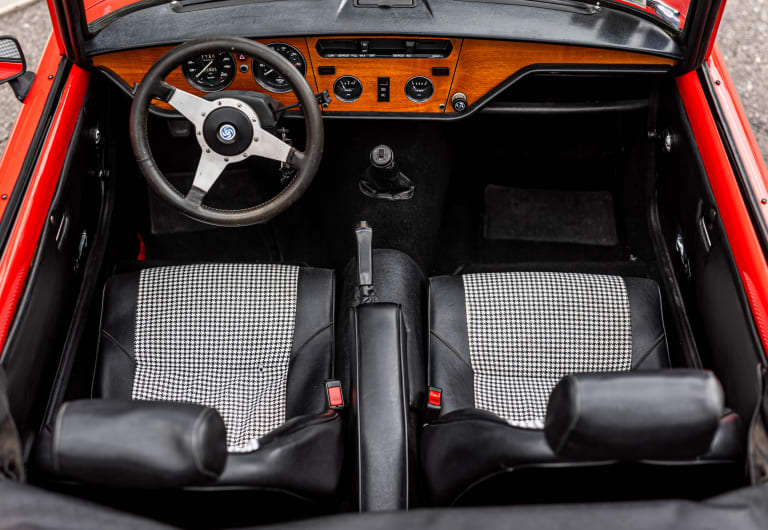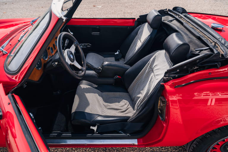 La carrosserie arbore une superbe peinture rouge « Armilhon », qui met en valeur ses lignes élégantes. La capote noire est en excellent état, et les jantes ont conservé tout leur éclat. À l’intérieur, le charme opère avec un skaï impeccable et des tissus à motif pied de poule en très bon état. La planche de bord en bois et l’instrumentation fonctionnelle offrent une touche de caractère vintage.