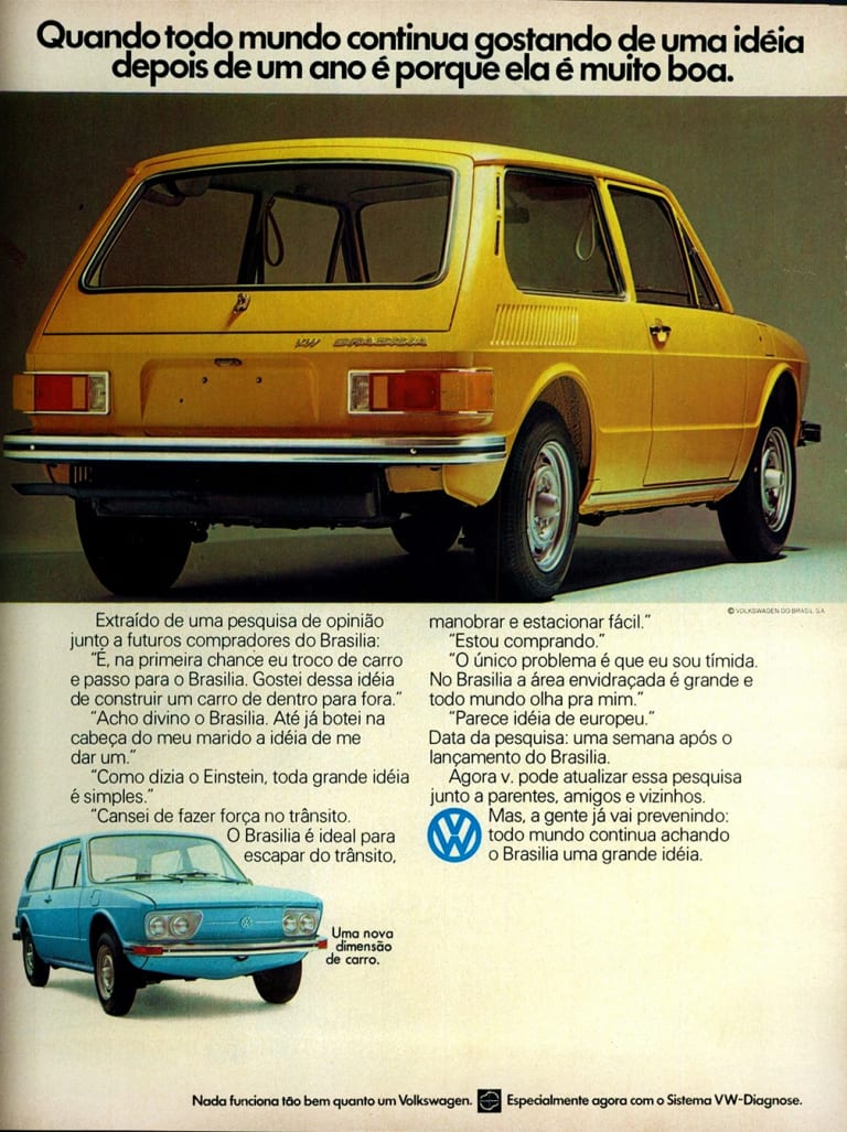 Rien que son nom, reprenant celui de la capitale brésilienne, prouve l’attachement qui lie Volskwagen au Brésil (et vice versa). C’est en septembre 1970 que le dynamique patron de la filiale brésilienne, Rudolf Leiding (sa capacité à augmenter de 50 % les ventes de VW au Brésil lui permettra d’atteindre en 1971 le poste suprême de PDG de Volkswagen, dont il assurera le redressement), décide de lancer un modèle spécifique au Brésil, et capable de remplacer la Fusca (le petit nom de la Cox là-bas) dans le cœurs des cariocas et des paulistes.