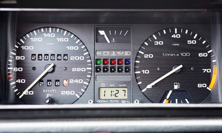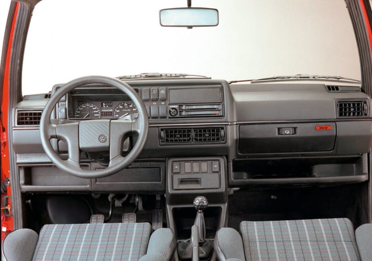 Synonyme d’un certain raffinement technique – la comparaison s’avérait particulièrement cruelle pour le turbo, le carburateur et l’arbre à cames latéral de la Renault 11 Turbo –, le quatre-cylindres VW était probablement le meilleur moteur de sa classe à l’époque, avec son injection Bosch K-Jetronic, ses deux arbres à cames en tête et, bien entendu, ses seize soupapes – technique certes totalement banalisée de nos jours mais qui, il y a quarante ans, flattait significativement l’orgueil des conducteurs supposément sportifs, lesquels pouvaient afficher le logo correspondant sur leur carrosserie (le prestige afférant était tel que l’on trouvait alors dans les centres auto de faux logos « 16s » ou « 16v » dont des esprits mesquins n’hésitaient pas à affubler de souffreteuses Opel Corsa ou Ford Fiesta premier prix, qui n’en demandaient pas tant). Par surcroît, agréable à contempler une fois le capot levé et présenté avec un soin qui contrastait violemment avec le médiocre fouillis qu’affichaient sans vergogne les moteurs français ou italiens, le 1781 cm3 allemand ne se contentait pas d’être beau. Par rapport à la GTI « 8 soupapes », les progrès étaient indéniables, avec une puissance en augmentation de 27 ch et une vitesse maximale passant de 191 à 208 km/h. C’est sans doute cette dernière valeur qui comptait le plus aux yeux de bien des acheteurs acceptant de payer leur Golf 17 % plus cher qu’une GTI « de base » : les voitures capables de dépasser les 200 chrono n’étaient pas si courantes à l’époque, et c’était d’autant plus vrai dans la catégorie des petites sportives ; au demeurant, on pouvait en dire autant des 29,6 secondes obtenues dans l’exercice du kilomètre départ arrêté.