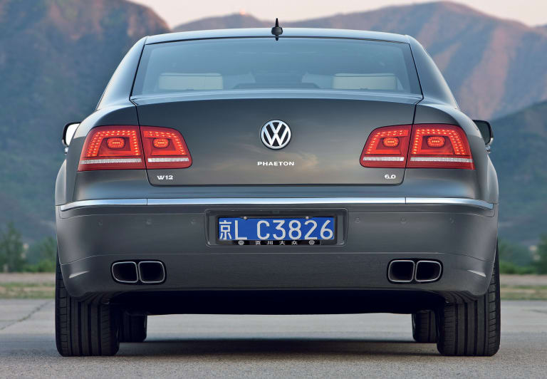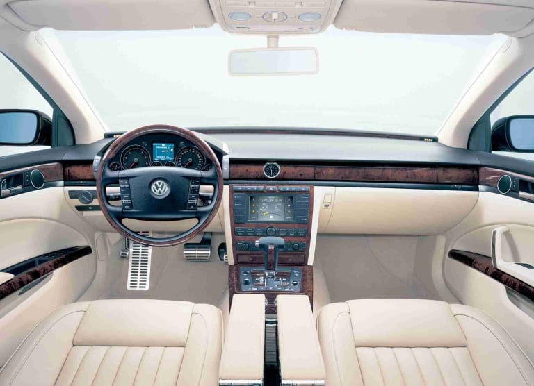 Car, dès l’abord, la Phaeton reçut, en guise de variante sommitale, l’un des plus fabuleux moteurs de son temps, sous la forme d’un W12 dont le concept car éponyme, présenté en 2001, avait eu la primeur avant que l’Audi A8 en dispose également, de façon très confidentielle cependant. Rappelons les caractéristiques de l’objet : plutôt que de concevoir un V12, comme on pouvait en trouver sous les capots des Mercedes Classe S et BMW Série 7, les motoristes Volkswagen décidèrent d’innover une fois encore en développant leur douze-cylindres sur la base de deux moteurs VR6 (celui que la Golf avait inauguré en 1991), assemblés selon un angle de 72 degrés. D’une cylindrée exacte de 5998 cm3 et disposant de quatre soupapes par cylindre, ce groupe développait, en toute simplicité, 420 ch à 6000 tours/minute, le couple atteignant pour sa part la valeur de 560 Nm dès 2750 tours. En 2002, une Mercedes S 600 ne dépassait pas 367 ch et il fallait se tourner vers la toute fraîche BMW 760i (445 ch) pour surpasser le moteur VW. Du point de vue des chiffres, la Phaeton 6.0 W12 n’avait donc de leçon à recevoir de personne, même si le poids de l’ensemble (2450 kilos à vide) n’aurait de toute façon pu s’accommoder d’un moteur souffreteux (il suffit de parcourir quelques kilomètres au volant d’une V6 TDI pour s’en convaincre). Admirablement construite, d’une qualité de finition à faire rougir une Classe S contemporaine, disposant par surcroît de l’avantage de la transmission intégrale, la Phaeton ainsi gréée avait tout pour séduire.