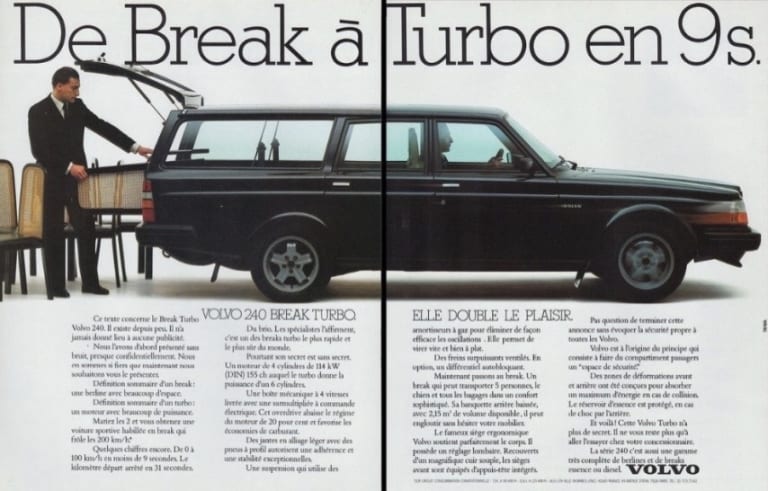 Forte de ces améliorations, la 240 turbo annonce un 0 à 100 km/h en 9s, un 1000m départ arrêté parcouru en 30s et le cap fatidique des 200 km/h atteint. Aujourd’hui, ces performances peuvent faire sourire, mais il est bon de les replacer dans le contexte de l’époque, cette 240 turbo clouait la concurrence (SAAB 900 T8, Renault 18 Turbo), les bombinettes stars (Peugeot 205 GTi, VW Golf GTi) et faisait jeu égal avec la remarquée BMW E30 323i. On peut dire qu’avec son break 240 turbo, Volvo créa le concept de break sportif quelques années avant l’arrivée de la BMW E30 325i Touring et plus de 10 ans avant l’arrivée de l’impressionnante Audi RS2.