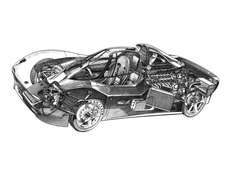 L’auto sera donc développé par Ypsilon Technology, et Robin Herd (l’un des fondateur de March) un peu comme une Formule 1 de route, avec une coque en carbone du même acabit que les bolides de circuit, et un moteur porteur directement boulonné dessus. Bien entendu, le V12 était un peu modifié et adapté à une utilisation routière, même s’il partageait l’essentiel avec son frère de F1, mais mine de rien, ces quelques changements faisaient baisser la puissance à seulement 400 chevaux, 260 de moins tout de même, alors que les supercars de l’époque ou en préparation commençaient déjà la course à la puissance (une Venturi 400 Trophy dotée du bon vieux PRV retravaillé et fiable sortait 408 chevaux, lire aussi : Venturi 400 Trophy, on vous parle même pas des McLaren ou Bugatti).