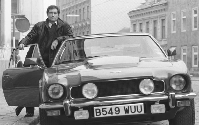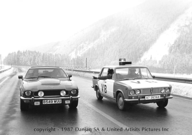 Il fallut attendre 1987 pour que l’AM V8 soit brutalement extirpée des grimoires poussiéreux jalousement préservés par les amateurs d’exotisme pour se retrouver en pleine lumière. Cette année-là, en effet, la société EON Productions, propriétaire des droits intellectuels sur le personnage de James Bond, présenta la quinzième aventure de l’agent 007, intitulée The Living Daylights et, outre l’arrivée d’un nouvel acteur pour succéder à Roger Moore en la personne de Timothy Dalton, le film fut aussi l’occasion de renouer avec la grande époque des Aston gadgétisées à outrance par le département Q. Immatriculées B549 WUU, les V8 apparaissant à l’écran (un cabriolet Volante, propriété de Victor Gauntlett, le patron d’Aston à l’époque, et un coupé Saloon, censées être une seule et même auto, ce qui ne pouvait tromper que les béotiens) reprenaient un fil interrompu depuis On Her Majesty’s Secret Service, dix-huit ans plus tôt. Souvenez-vous de la DBS V8 de George Lazenby (lequel incarnait Bond pour la première et la dernière fois), très proche de l’AM V8, qui ne jouait qu’un rôle anecdotique mais dans laquelle son épouse Tracy trouvait une mort tragique… Par la suite, la période Moore fit la part belle aux Lotus Esprit – plus modernes, plus incisives, plus sportives, et ainsi de suite – et c’est pourquoi le retour d’Aston aux affaires constitua une vraie surprise.