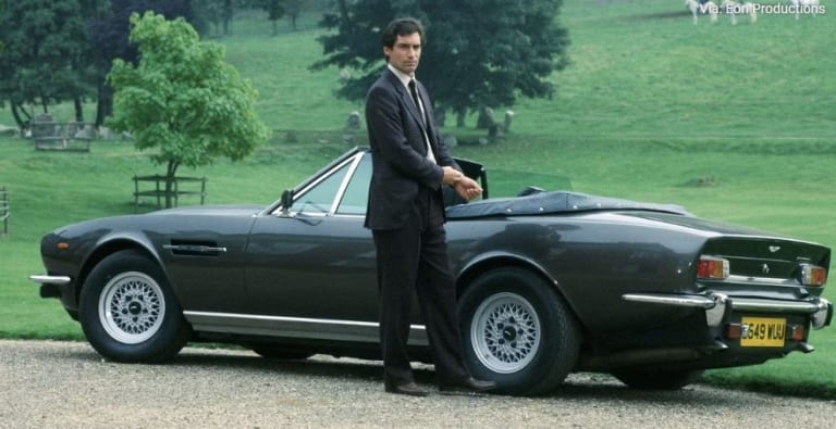 En près de soixante ans et vingt-cinq films « officiels », James Bond n’a pas roulé qu’en Aston Martin, loin s’en faut ; pourtant, dans la mémoire collective, l’agent secret le plus célèbre du monde demeure à tout jamais associé à la vieille firme britannique, demeurée dans les limbes d’une certaine confidentialité jusqu’à ce que la DB5 truffée de gadgets apparaissant dans Goldfinger la propulse sous les projecteurs, au propre comme au figuré. Si cette dernière est devenue depuis longtemps une légende et même un personnage à part entière, l’AM V8 qui nous intéresse aujourd’hui n’a pas démérité pour autant, en apparaissant dans deux films de la série à 34 ans de distance !