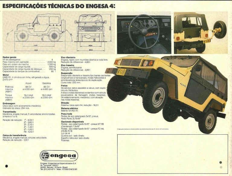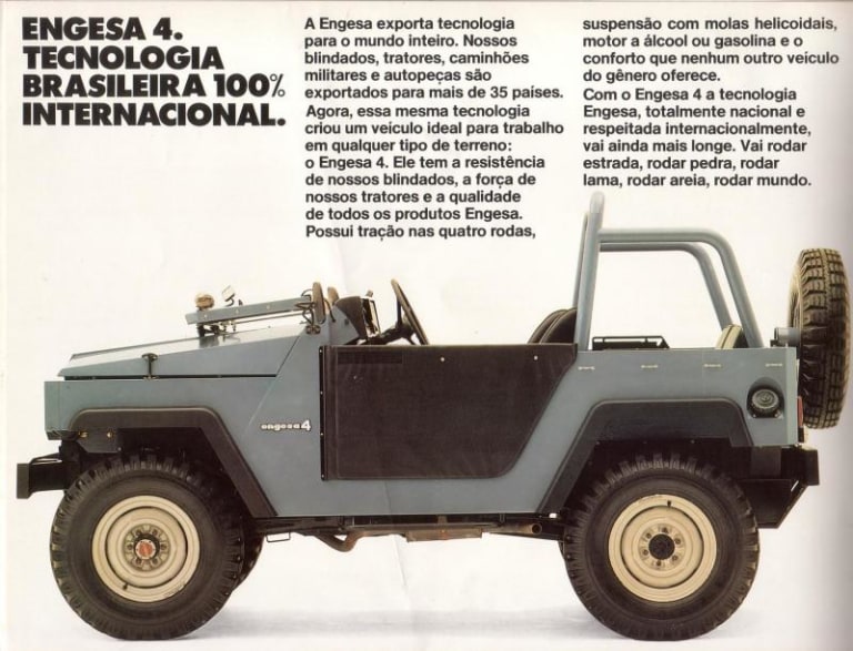 C’est à partir de 1983 que la firme d’armement brésilienne Engesa, plus connue pour sa production de blindés que pour sa production automobile, se décide à se lancer dans l’étude et la fabrication d’une Jeep à usage militaire pour équiper l’armée brésilienne ou utilitaire pour le marché civil. Il s’agit d’un véhicule rustique, récupérant de nombreuses pièces issues de la production automobile brésilienne pour en abaisser le coût (GM notamment), relativement compact (il s’agit de remplacer les vieilles Jeep de l’armée brésilienne), et doté de capacités de franchissement, évidemment !