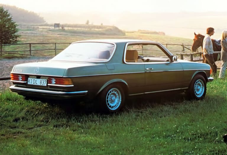 Produit de 1969 à 1976, le coupé établi sur la base des berlines dites Strich-Acht aura pleinement rempli la mission qui lui avait été assignée, à savoir élargir vers le bas la gamme des Mercedes à deux portes, jusqu’alors incarnée par les très dispendieux coupés W111/W112. Avec cette série, la firme à l’étoile est parvenue à s’implanter au firmament d’un segment de marché dans lequel s’ébattaient alors des constructeurs généralistes tels que Peugeot, Fiat ou Opel – celui des coupés mi-familiaux mi-bourgeois, bien motorisés mais sans excès, dépourvus de toute ostentation, s’adressant à une clientèle férue d’exclusivité mais ne pouvant s’offrir les performances et le luxe véritable d’une BMW E9. Avec ses lignes sobres mais idéalement proportionnées et son toit surbaissé reprenant le gimmick du roadster SL « Pagode » (les deux voitures ayant été dessinées par Paul Bracq), le coupé C114, exclusivement animé par de nobles six-cylindres, incarnait à merveille la distinction un peu guindée (mais inaliénable) propre aux Mercedes de ce temps-là. C’est donc fort logiquement que, commencée en 1969, l’étude de la série 123, destinée à remplacer la Strich-Acht, inclut dès l’abord une version coupé, laquelle ne provoqua aucune surprise quand elle fut présentée officiellement, au Salon de Genève 1977…