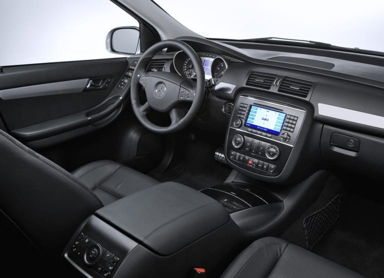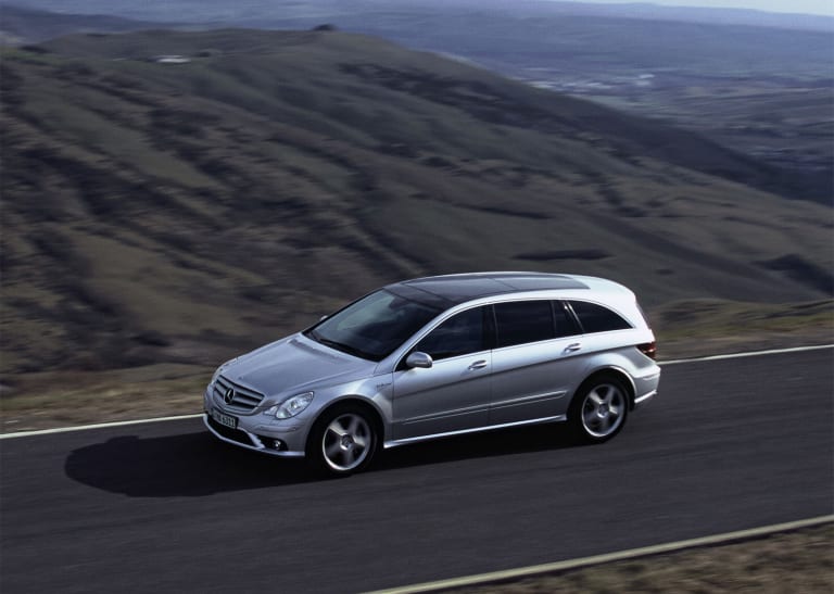 Voulant démontrer « l’attractivité et la polyvalence d’un nouveau concept de voiture familiale spacieuse, confortable et performante », feu le Prof. Jürgen Hubbert, qui dirigeait alors la firme, défendait l’auto avec d’autant plus d’ardeur qu’il ne s’agissait pas là d’un prototype sans lendemain mais bien du préambule à un futur modèle de série, confirmé deux ans plus tard au même endroit par la Vision Grand Sports Tourer (en toutes lettres, cette fois), débarrassée des outrances du premier show car (portes antagonistes, console centrale innovante à commandes sensitives, architecture des sièges, etc.) et désormais très proche de l’industrialisation, qui intervint pour le millésime 2006 sous le nom de Classe R, disponible en deux empattements, le modèle Lang étant le seul proposé en Amérique du Nord. L’R de quoi, au fait ? Personne n’a jamais été en mesure d’expliquer de façon intelligible le choix de cette lettre pour désigner le modèle, en dehors du fait qu’elle précède le S dans l’alphabet. De là à assimiler cette voiture à une sorte de break Classe S, il n’y a qu’un pas — que nous ne franchirons pas. Même en ayant copieusement recours au très épais catalogue d’options, la R-Klasse, assemblée en Alabama dans la même usine que les ML et GL dont elle reprenait la plateforme, n’était pas tout à fait digne des standards du made in Germany, et en tout cas pas du raffinement de la toute récente S-Klasse W221, en dépit d’un éventail de motorisations en partie partagé avec celle-ci et qui lui garantissaient un agrément de conduite de bon niveau. De fait, on pouvait légitimement se poser une question cruciale : à qui s’adressait donc cette voiture ? Les amateurs de breaks logeables et rapides pouvaient déjà compter sur les ressources de la Classe E ; on l’a vu, ceux qui préféraient les SUV avaient amplement de quoi s’occuper et, en définitive, la cible visée apparaissait donc singulièrement restreinte, l’impressionnante capacité d’emport de la « R » (2400 litres pour la version longue, une fois tous les sièges rabattus) ne figurant pas nécessairement en tête des préoccupations d’une clientèle capable de débourser un minimum de 54500 euros pour repartir au volant de ce crossover à l’identité sans doute diluée entre plusieurs concepts trop éloignés les uns des autres.
