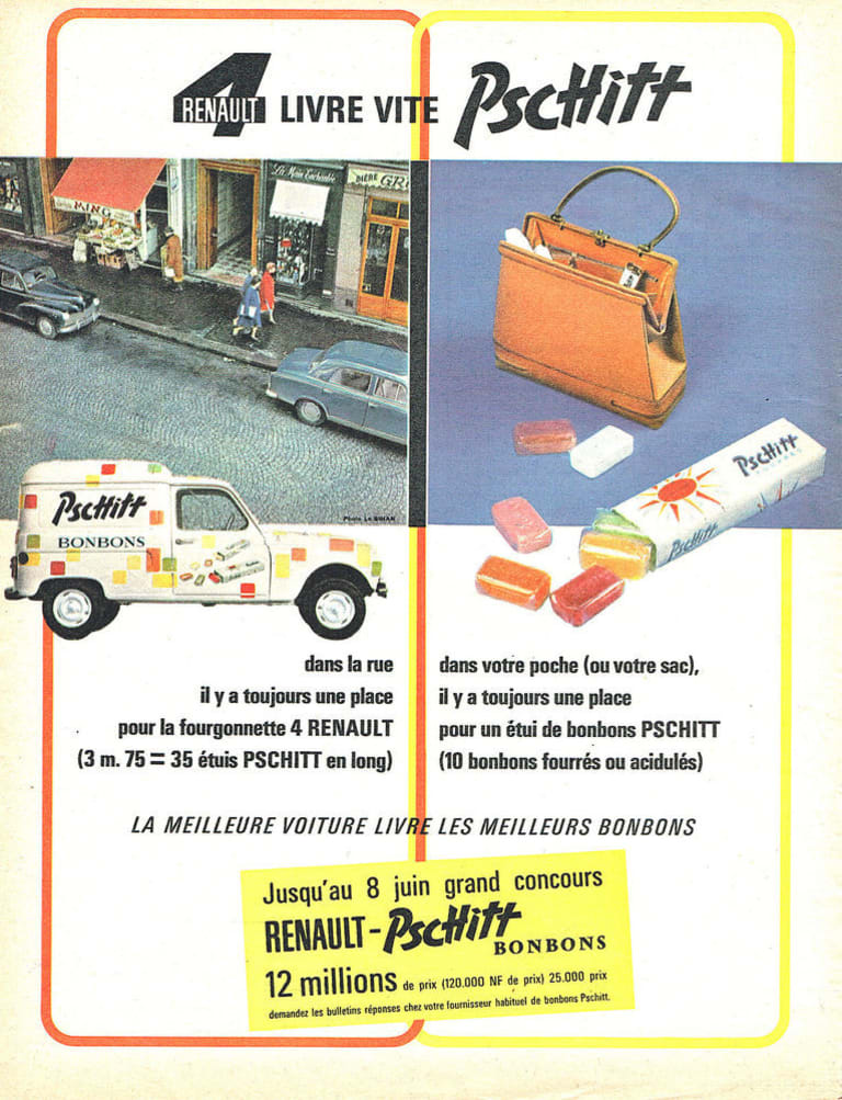 C’est donc en 1961 qu’est présentée la Renault 4 Fourgonnette, d’une charge utile de 300 kg et 2 m3 de volume. Grâce à son unique siège (le deuxième est en option), son plancher plat et son “girafon” (ouverture située au dessus de la porte arrière facilitant le chargement ou l’emport d’objets volumineux), la Renault 4 Fourgonnette est particulièrement adaptée aux besoins d’une clientèle appréciant la praticité d’un tel véhicule. En conservant la cellule avant identique à la Renault 4, la Fourgonnette gagne un côté branché qui ne laissera pas insensibles les grandes marques elles-mêmes : les Eaux Perrier-Vittel et leur filiale Pschitt, l’EDF, les PTT, Renault elle-même pour ses succursales et tant d’autres.